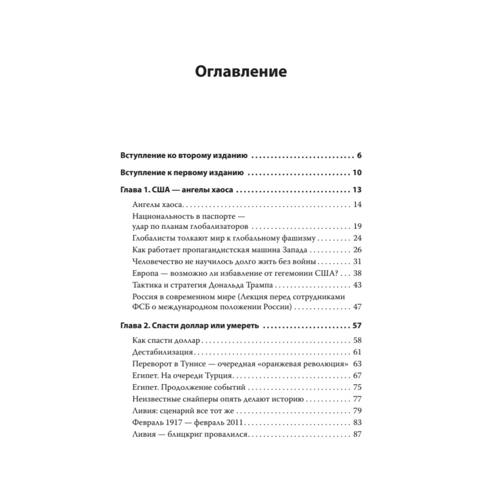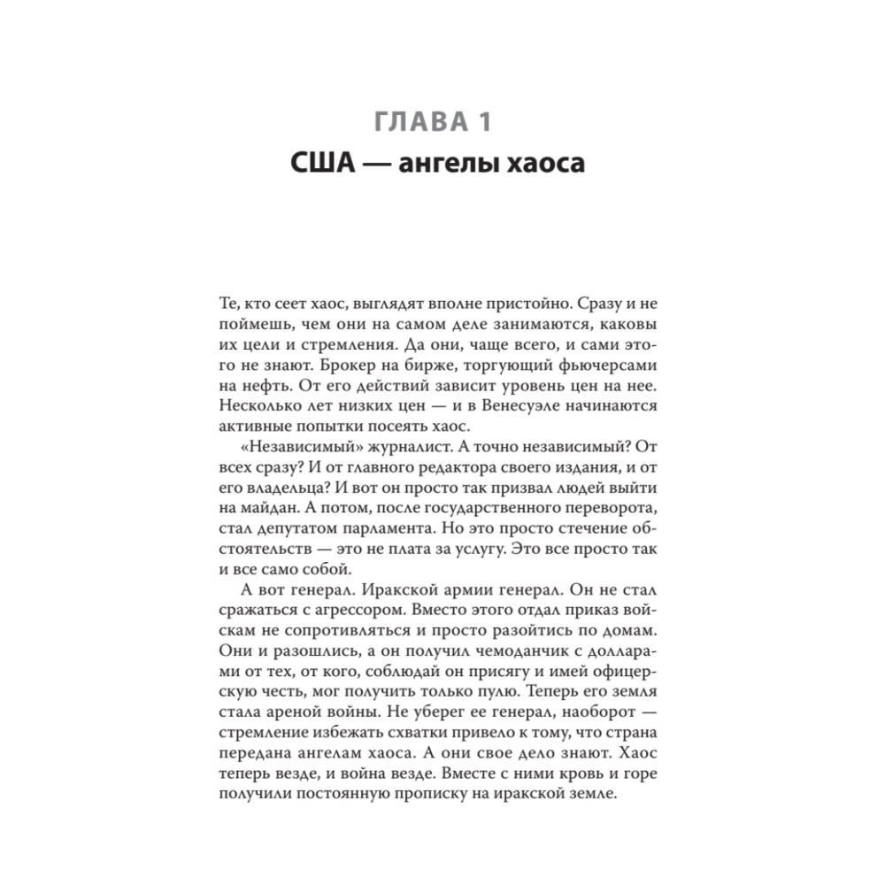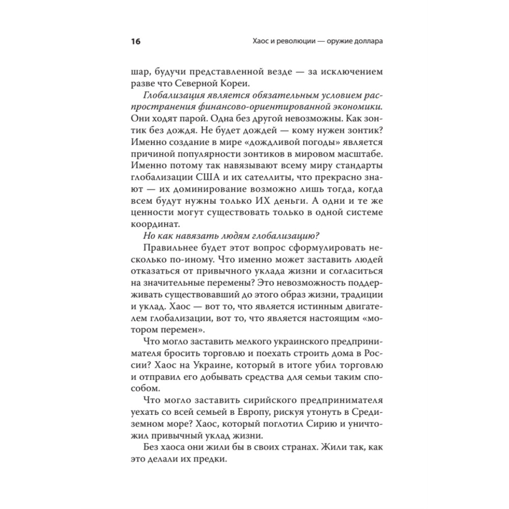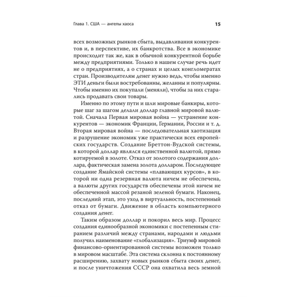 С момента выхода первого издания этой книги прошло шесть лет. Тема, обозначенная в ней, к сожалению, стала еще более актуальной. Хаос распространился по всему Ближнему Востоку, идет война в Сирии, на Украине, миллионы беженцев заполонили Европу. Многое изменилось за это время, неизменным осталось лишь одно: суть происходящих событий. Хаос и революции — не просто спутники борьбы доллара, США и Западного мира в целом за мировую гегемонию, они — инструменты этой борьбы. Но что-то у «ангелов хаоса» пошло не так. Китай теснит Запад. Россия тоже не собирается сдавать позиции. Раз по правилам «джентльмены» проигрывают — они меняют правила игры. Это значит, конец предсказуемой политики Вашингтона. Сегодня в мире никто не может быть уверен в своем будущем. Желаемый итог — новое Средневековье. Хаос везде и повсюду, а порядок только в строго отведенных местах — в «граде на Холме», то есть у них, у англосаксов. Главной целью для атак сегодня выбрана Россия. И это происходит потому, что у нас есть слабое звено. Таким звеном является российская элита, вернее, псевдо-элита, которая слишком тесно связана с Западом и ориентируется на него. Все поражения ХХ века были связаны именно с этим. Поэтому пришло время появления новых имен, партий, идей. Этап простого сохранения России подошел к концу. Наступил этап движения вперед, восстановления мощи и смыслов. Читайте обо всём этом во втором, наполовину обновленном издании книги.