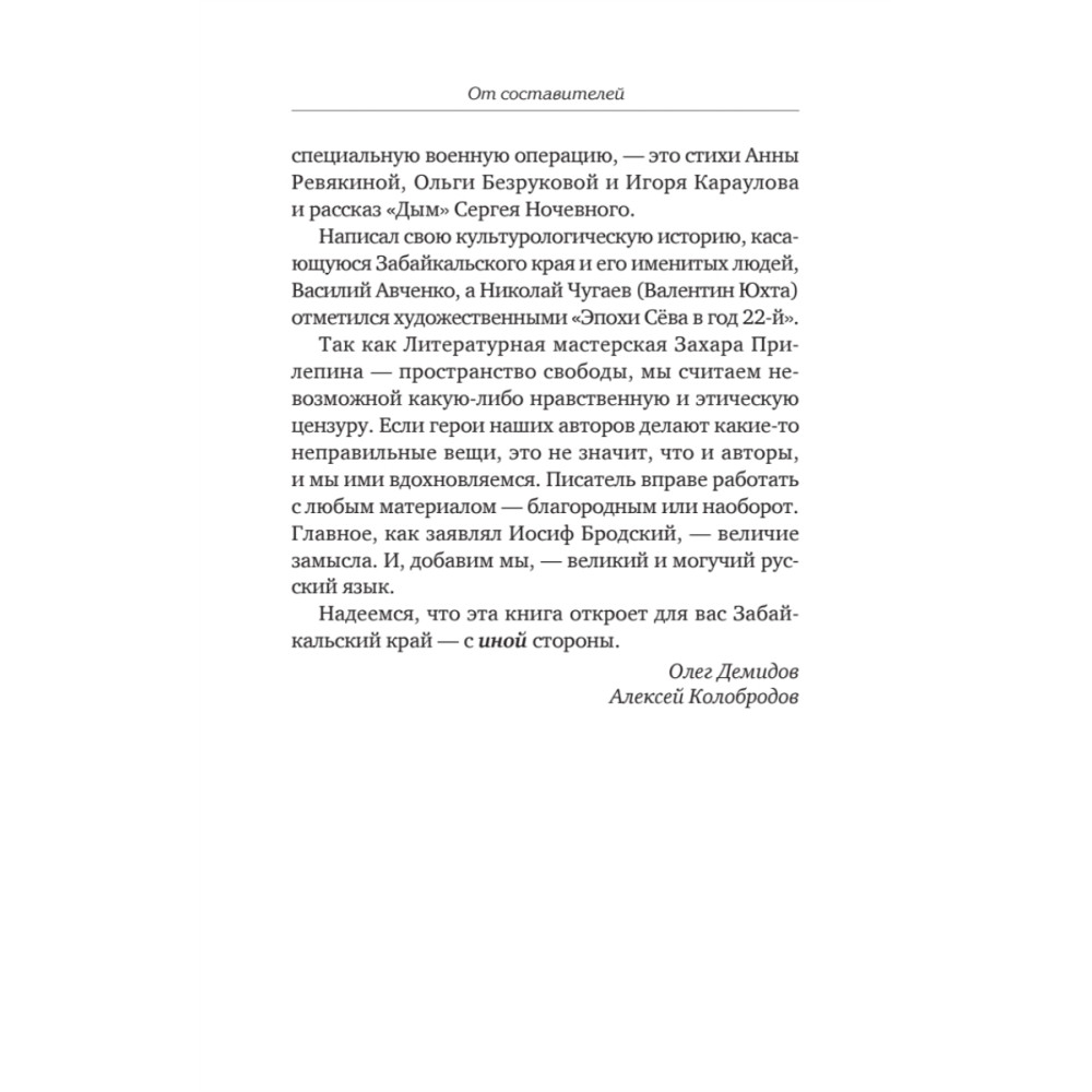 Забайкальский край — необъятный, богатый, удивительный и красивейший — не может не вдохновлять. Подтянутая, с военной выправкой Чита, воды Арахлея, горы Алханая, Нерчинск — все это нашло вдохновение в стихах и рассказах 26 выпускников Литературной мастерской.