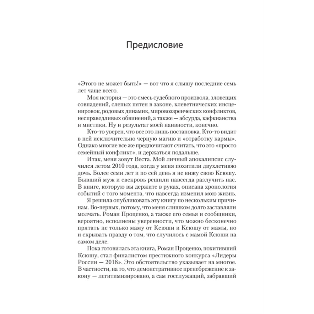 Эта история — смесь судебного произвола, слепых пятен в законе, клеветнических инсценировок, и несправедливых обвинений. Конфликт, вышедший за пределы одной семьи, связавший судьбы сотен людей по всей стране, и даже за ее пределами. Автор книги – Веста Спиваковская – журналистка, колумнистка, теле- и радиоведущая – столкнулась с проблемой, которая стала настоящим стихийным бедствием, но при этом остается незаметной для большинства граждан страны. В 2010 году муж решил навсегда разлучить ее с дочерью. По данным международных правозащитных организаций в России ежегодно исчезает более 55 тысяч несовершеннолетних детей. Семейный «киднеппинг» в России не регулируется на законодательном уровне и не обсуждается в обществе. Он объединяет родителей в борьбе за свои права, но при этом оставляет их в «одиночной капсуле» собственного горя. Эта книга – не просто авторская исповедь. Ее задача - вывести проблему семейного киднеппинга в область публичной дискуссии. Она посвящается родителям — матерям и отцам — которые попали в похожую ситуацию, но не отчаиваются и не сдаются. А также всем небезразличным людям, которые борются с этим на законодательном, общественном и личном уровне.