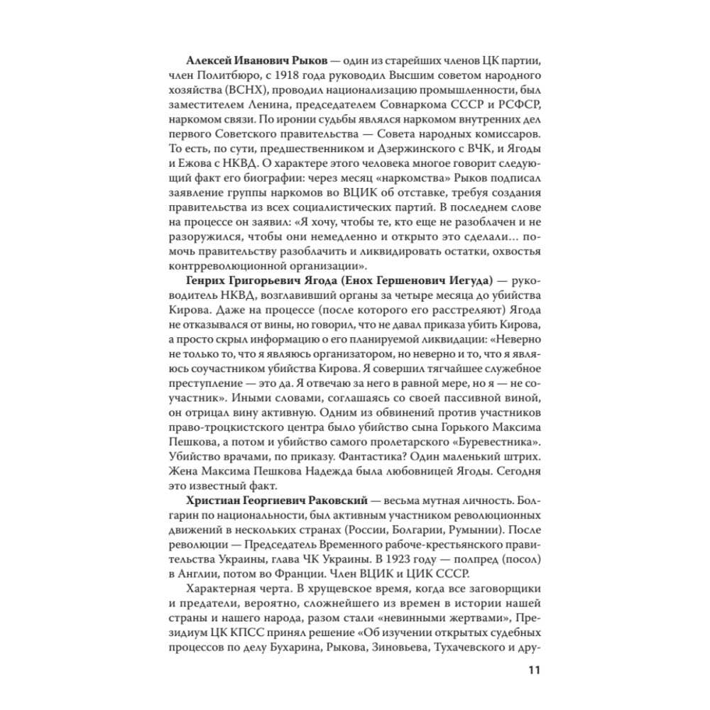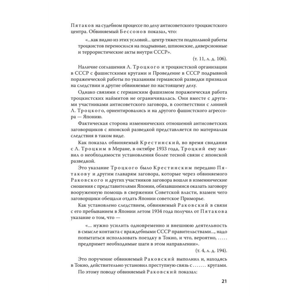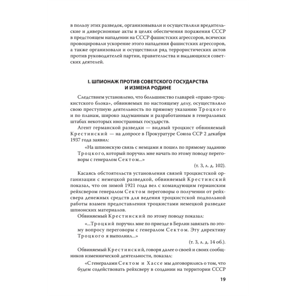 Судебный отчет, который вы держите в руках, был издан в СССР в 1938 году. Сегодня это библиографическая редкость – большинство книг было уничтожено при Хрущеве. Речь идет о процессе «Антисоветского право-троцкистского блока», который состоялся в марте 1938 года в Москве. Как получилось, что большое количество руководителей партии было обвинено в тягчайших преступлениях? Что стояло за этими процессами и были ли обвиняемые действительно виноваты? Могло ли быть так, что все они были абсолютно невиновны? Вопросов очень много. И главный из них звучит так: почему основные обвиняемые, «несгибаемые большевики», революционеры с громадным стажем, открыто признались во всем или почти во всем? О своей невиновности не заявил ни один! А ведь эти процессы проходили не при закрытых дверях. Открытый зал, сидящие в нем журналисты, обвиняемые находятся совсем рядом с ними. Все открыто, все публично.