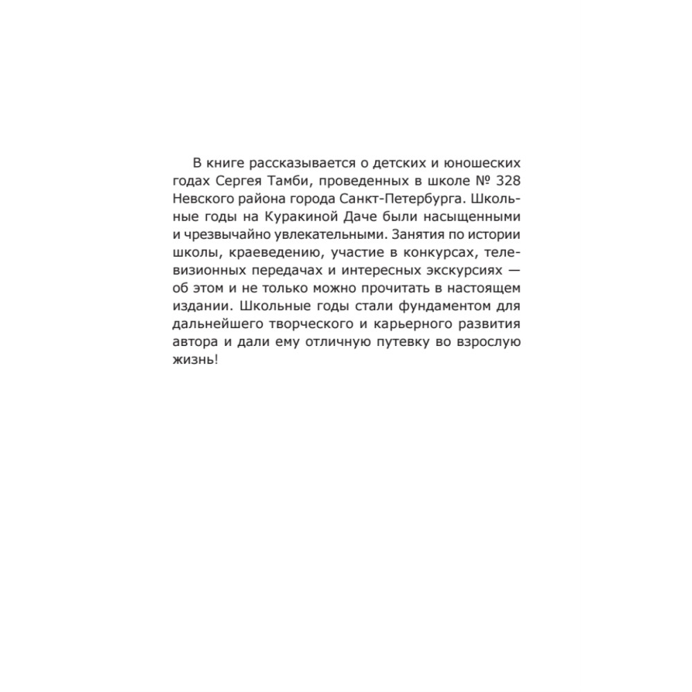 В книге рассказывается о детских и юношеских годах Сергея Тамби, проведенных в школе № 328 Невского района Санкт-Петербурга. Школьные годы на Куракиной Даче был насыщенными и чрезвычайно увлекательными. Занятия по истории школы, краеведению, участие в конкурсах, телевизионных передачах и интересных экскурсиях – об этом и не только можно прочитать в настоящем издании. Школьные годы стали фундаментом для дальнейшего творческого и карьерного развития автора и дали ему отличную путевку во взрослую жизнь!