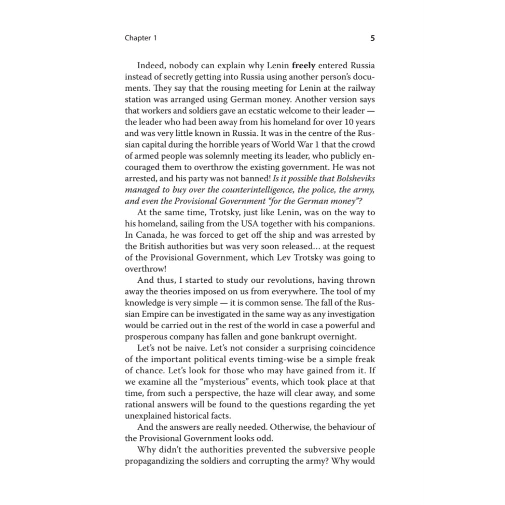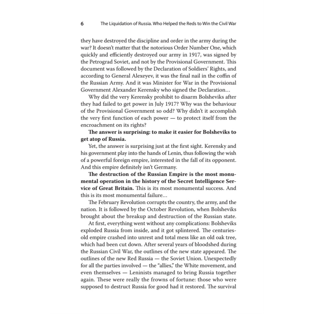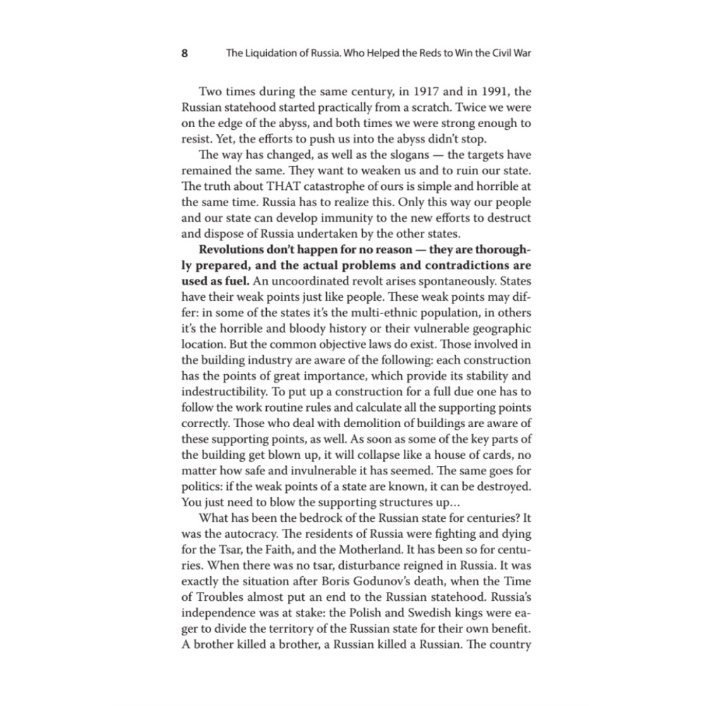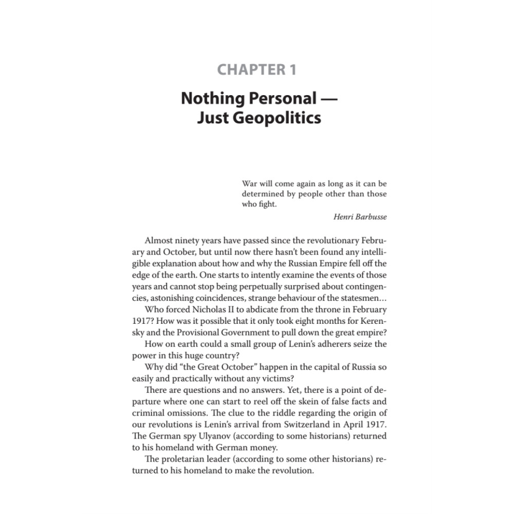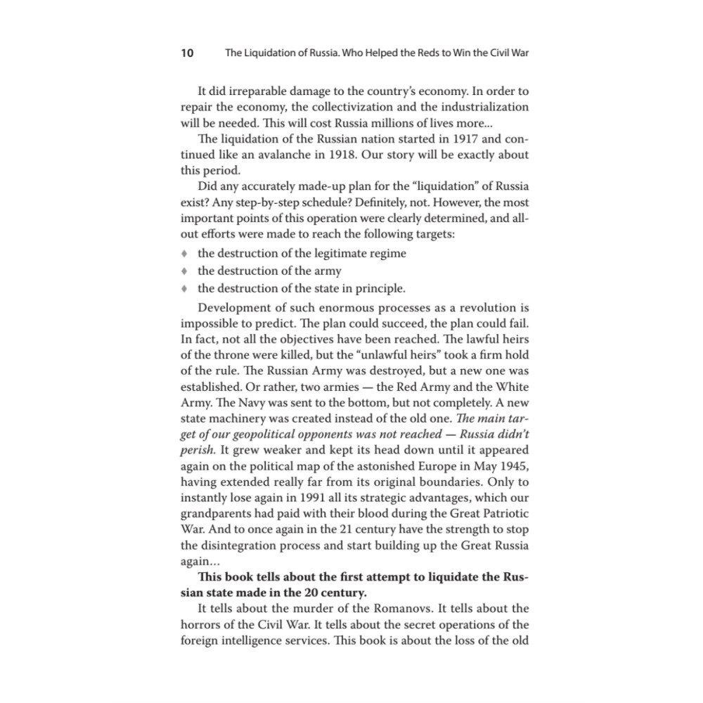 The book by Nikolay Starikov, the author of bestselling “Rouble Nationalization – the Way to Russia's Freedom”, “Who set Hitler against Stalin?” and many others, follows the events of the Civil War. The Russian statesmanship, its territorial integrity, and the economy of the country perished in the vortex of the Civil War. The Romanovs, the Russian Navy, the Russian Army, and millions of Russians were destroyed. The consequences of this horrible civil strife have not been overcome until today. In this book, you will find a lot of little-known facts, as well as answers to many questions: