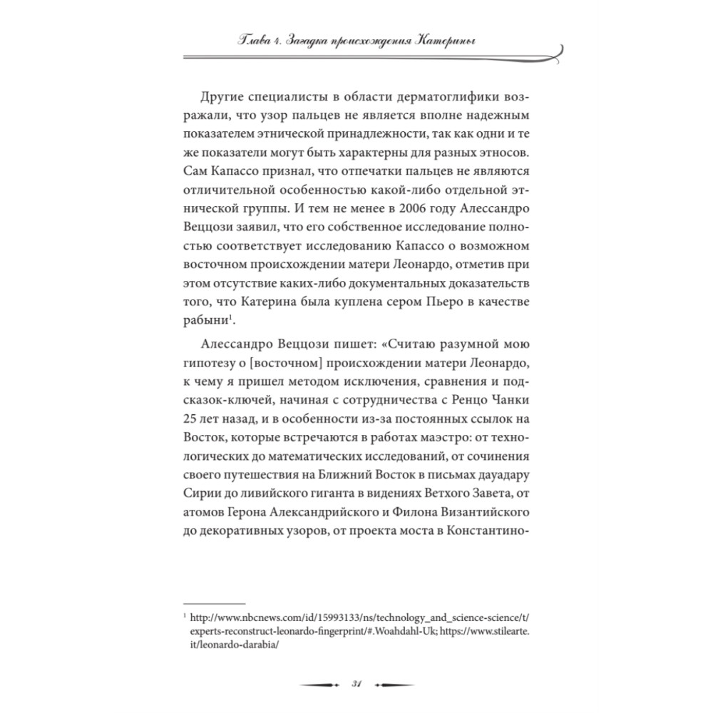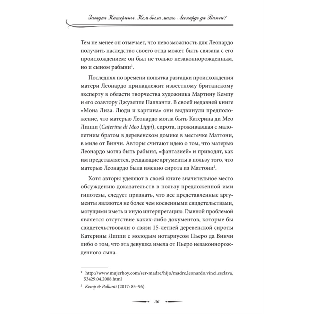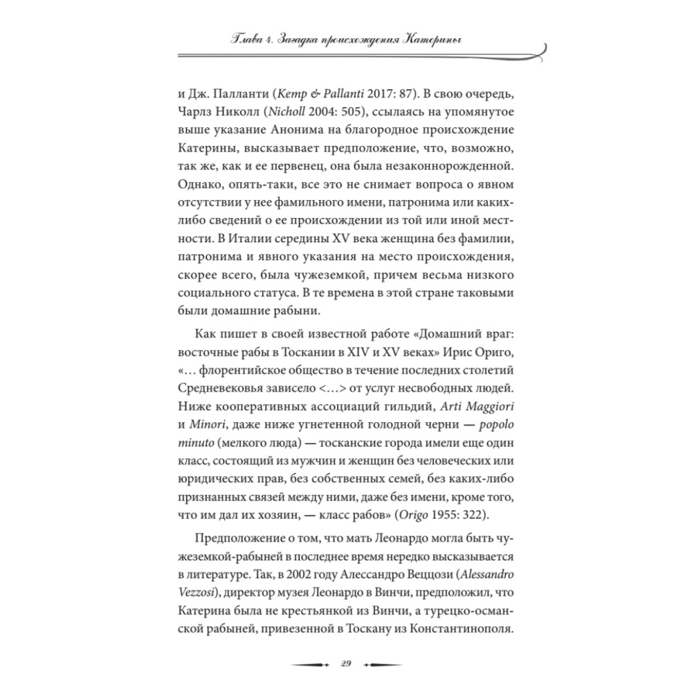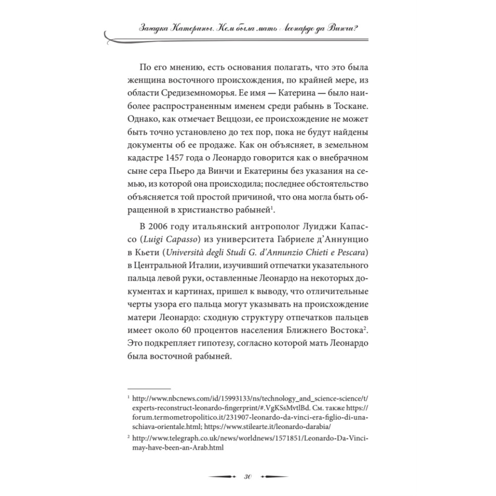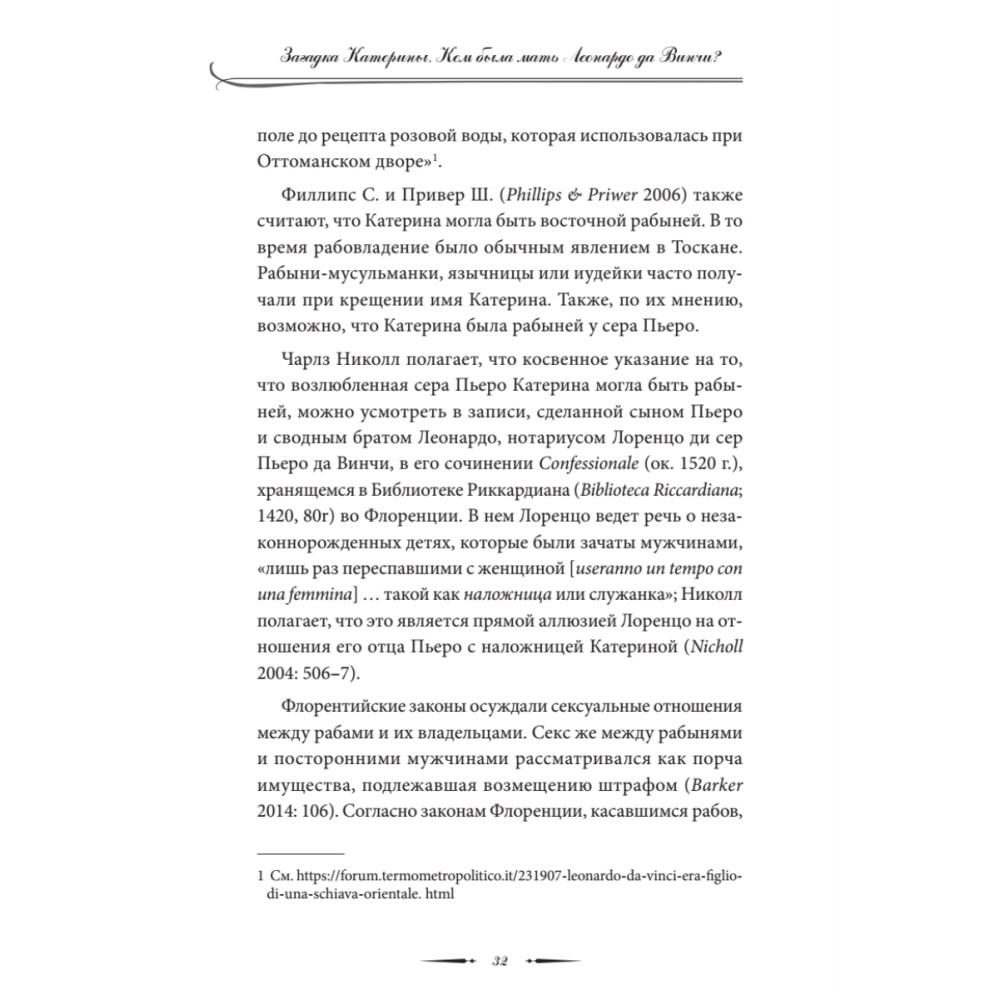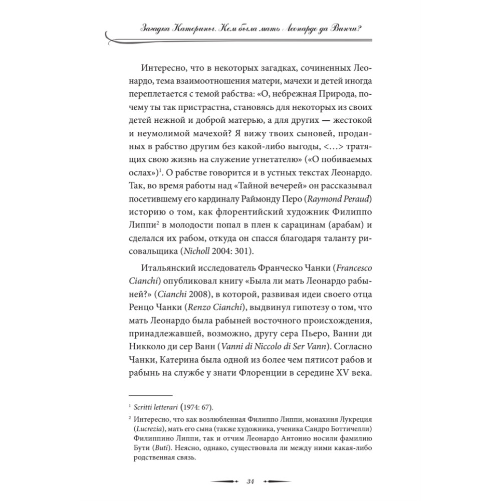 Отцом великого художника и ученого Леонардо да Винчи был флорентийский нотариус сер Пьеро да Винчи. Но кем была его мать? Кроме имени — Катерина — о ней ничего не известно, история ее жизни покрыта мраком. Автор эссе пытается приоткрыть завесу тайны происхождения загадочного гения эпохи Возрождения. Основываясь на анализе ряда фактов и свидетельств, он выдвигает гипотезу о том, что мать художника могла быть абхазской или черкесской рабыней, привезенной в Италию с Черноморского побережья Кавказа. Романтическая связь рабыни Катерины с молодым преуспевающим нотариусом сером Пьеро да Винчи завершилась рождением мальчика, получившего при крещении имя Леонардо. Профессор филологии Вячеслав Чирикба защитил докторскую диссертацию в Лейденском университете в Нидерландах. Он является автором ряда книг и статей, посвященных языкам, истории и мифологии народов Кавказа.