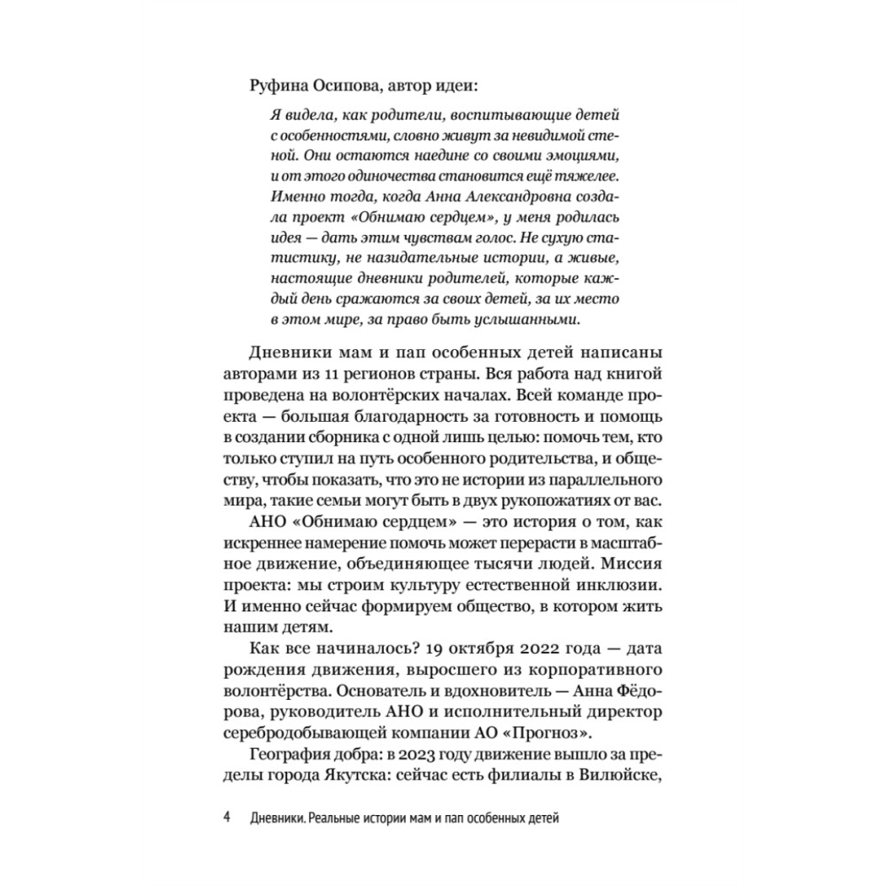 Перед вами сборник искренних рассказов о силе духа, вере и родительской любви. Это собрание настоящих историй от родителей, которые столкнулись с непростыми испытаниями, воспитывая детей с инвалидностью и ограниченными возможностями здоровья. Каждая страница пропитана глубокими переживаниями и непоколебимой верой в лучшее. В книге мамы и папы найдут эмоциональную опору и практические рекомендации, а их близкие, друзья и педагоги - простые способы помочь семье. Читайте, сопереживайте, дайте этим историям коснуться вашего сердца. Сканируйте QR-код, чтобы присоединиться к сообществу "Обнимаю сердцем" и подержать его проекты.