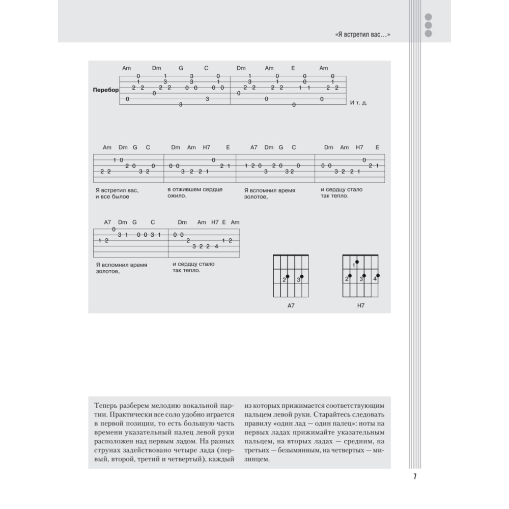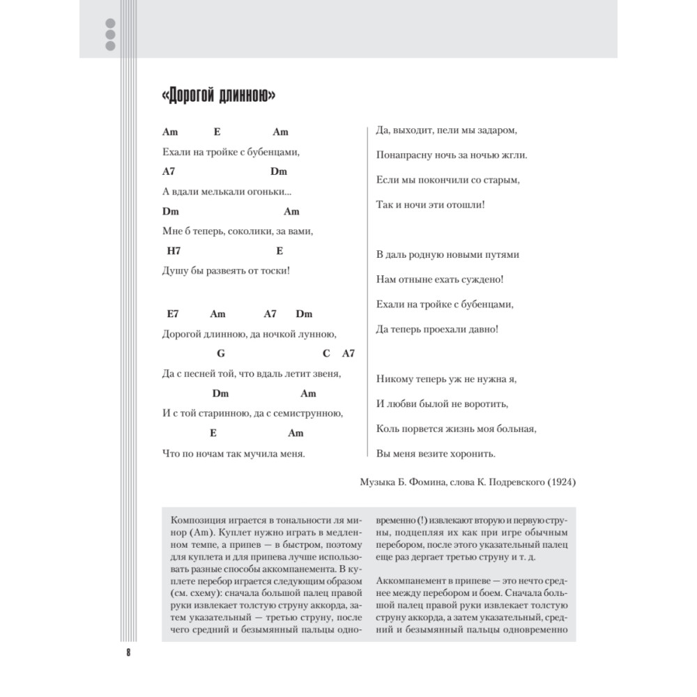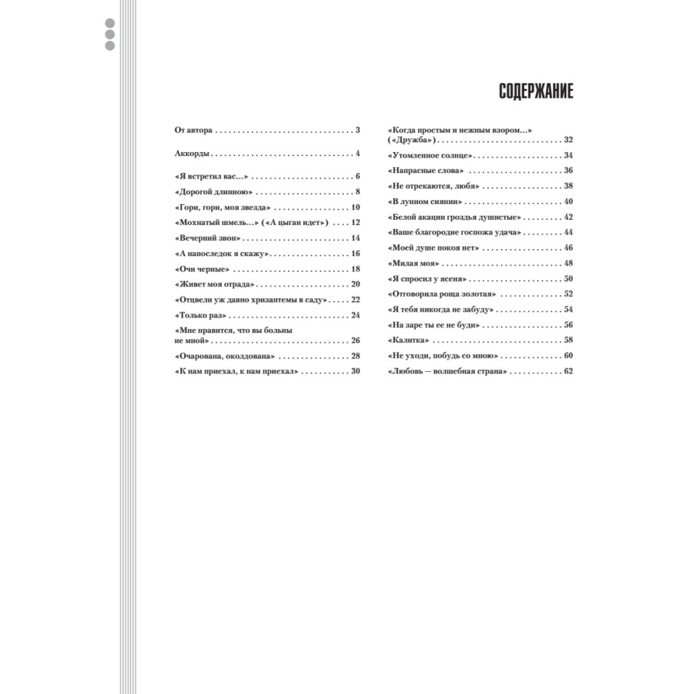 Устал от дворово-рокового репертуара под гитару? Настроение совсем не азартно-компанейское? Настигли любовь и ностальгия? Тогда пришло время старых добрых романсов под гитару! Что может выразить чувства лучше, чем «Гори, гори, моя звезда», «Очи черные», «Я встретил вас», «Очарована, околдована», завоевавшие любовь не одного поколения слушателей? Только мелодичные и задушевные хиты советской эстрады и кино, которые также можно найти в этом сборнике! К полному тексту каждого романса и аккордам прилагаются простые и удобные даже для начинающего гитариста табулатуры, поэтому сборник может стать отличной школой игры! При должном усердии это будет довольно просто, когда ваш учитель -- преподаватель с 15-летним стажем Дмитрий Агеев, написавший уже не один десяток книг по гитарному мастерству!