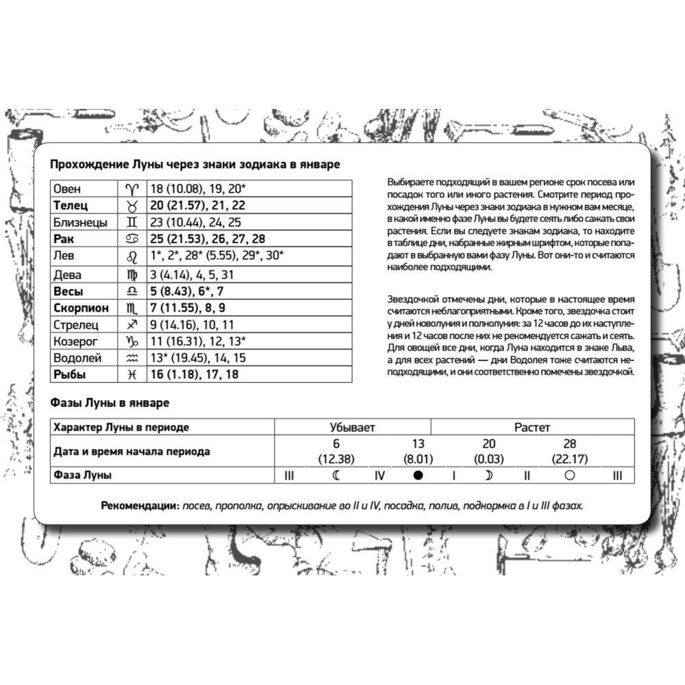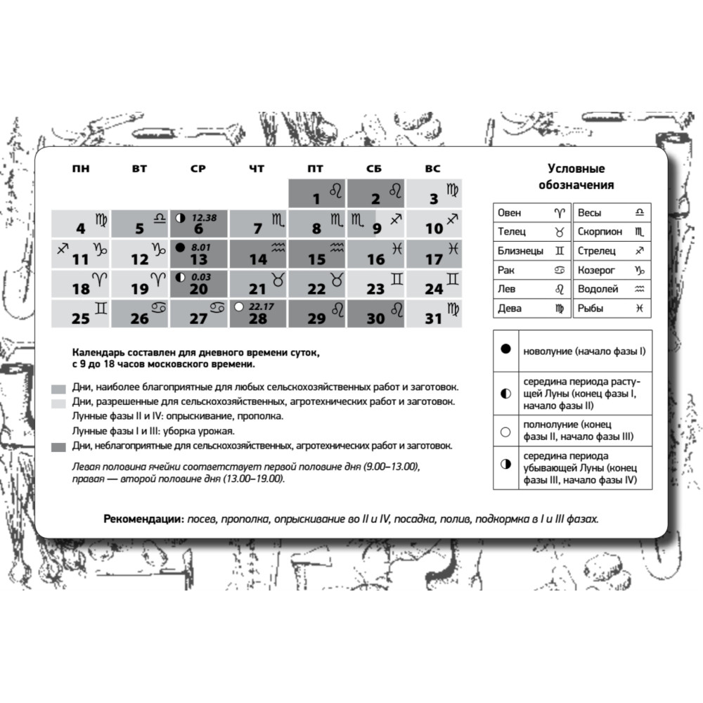 Лунный дачный календарь составлен с учетом астрономически выверенных лунных ритмов. Полезное дополнение — лунный календарь на каждый месяц в практичном формате «Семафора». Отдельно сгруппированы благоприятные и неблагоприятные для работы с растениями дни.