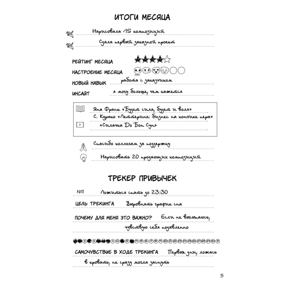 Ежедневник построен на трекинге главных составляющих нашей жизни: • погода • мотивация • регулярные занятия • водный баланс • физическая активность • настроение • сон • аффирмации • инсайты • привычки
