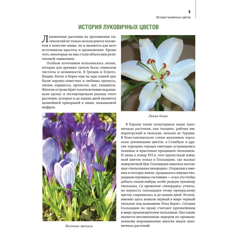 В XVII веке цветочные луковицы ценились на вес золота. Они преподносились в бархатных футлярах в подарок сильным мира сего. Сегодня луковичные цветы украшают наши клумбы, балконы, террасы, подоконники, красуются в букетах. Крокусы, нарциссы, тюльпаны первыми встречают весну; ирисы и лилии радуют нас в летние месяцы; крокосмии, фрезии и гладиолусы цветут до поздней осени.