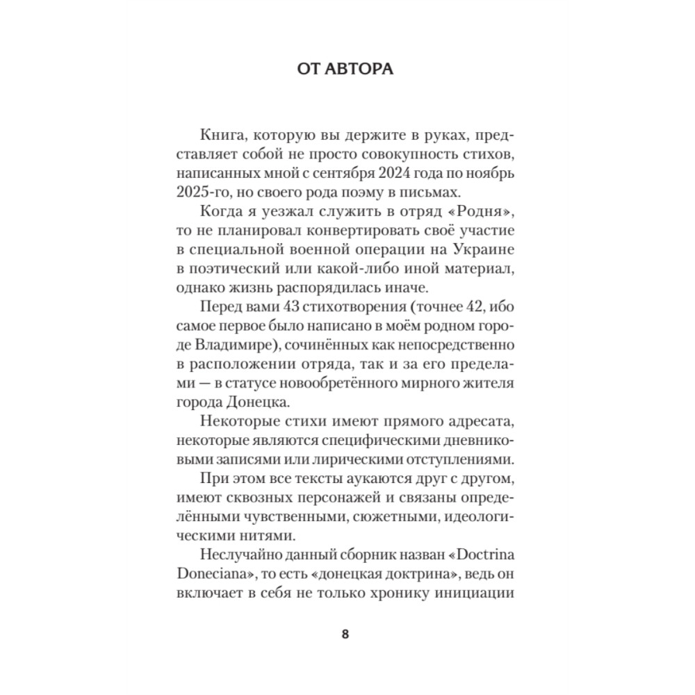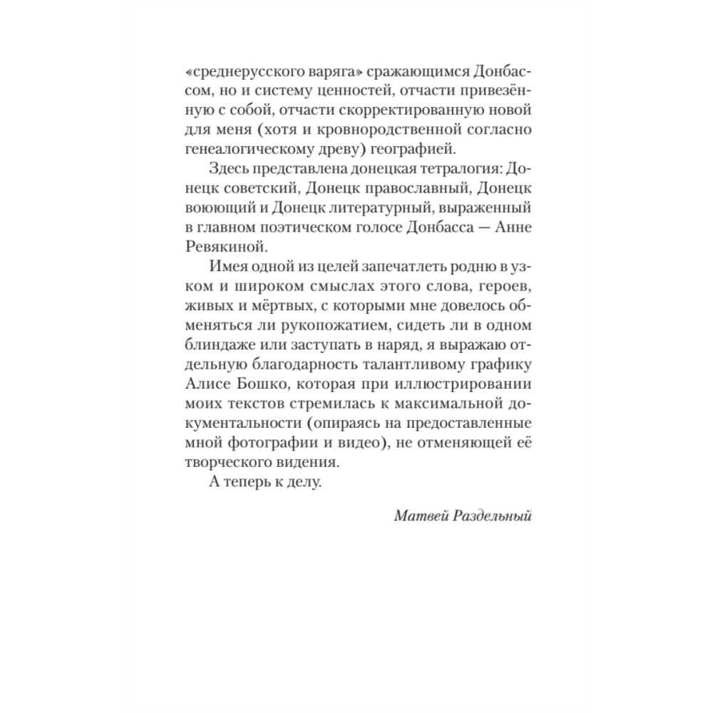 Матвей Раздельный – поэт, прозаик, публицист и литературный критик, автор разнообразных антологий и член жюри ряда литературных премий, уехал из родного города Владимира добровольцем на СВО, а после окончания контракта – остался жить в Донецке. “Doctrina Doneciana” – его дебютная поэтическая книга, которую можно сравнить с “Романтическими цветами” Николая Гумилёва: Гумилёв посвятил первое издание Анне Горенко (Ахматовой), а Раздельный – донецкой поэтессе Анне Ревякиной, Гумилёв написал цикл стихов о любви и сражениях в Африке, а Раздельный – о любви и сражающемся Донбассе. При этом Раздельный ни секунды не подражает, хотя и намеренно отсылает к огромному количеству текстов классиков и современников, работая в свойственной только ему манере – методом скрещивания бытописательства и литературоведческих ребусов и шарад.