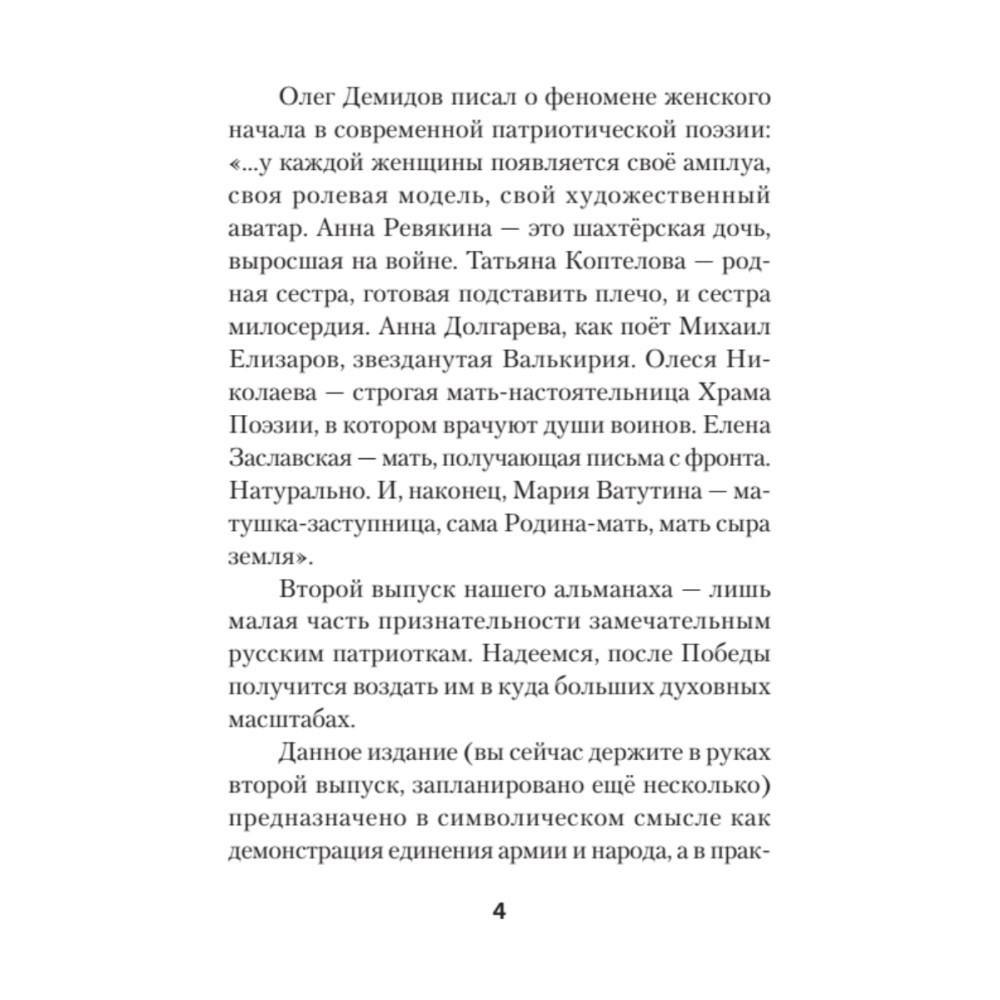 Во втором выпуске альманаха «Родня» мы сделали то, что должно — отдали его целиком представительницам прекрасной половины человечества. СВО сделала их голоса тем камертоном, по которому русский народ сверяет свои души. Только честно — только для своих. Слава России!