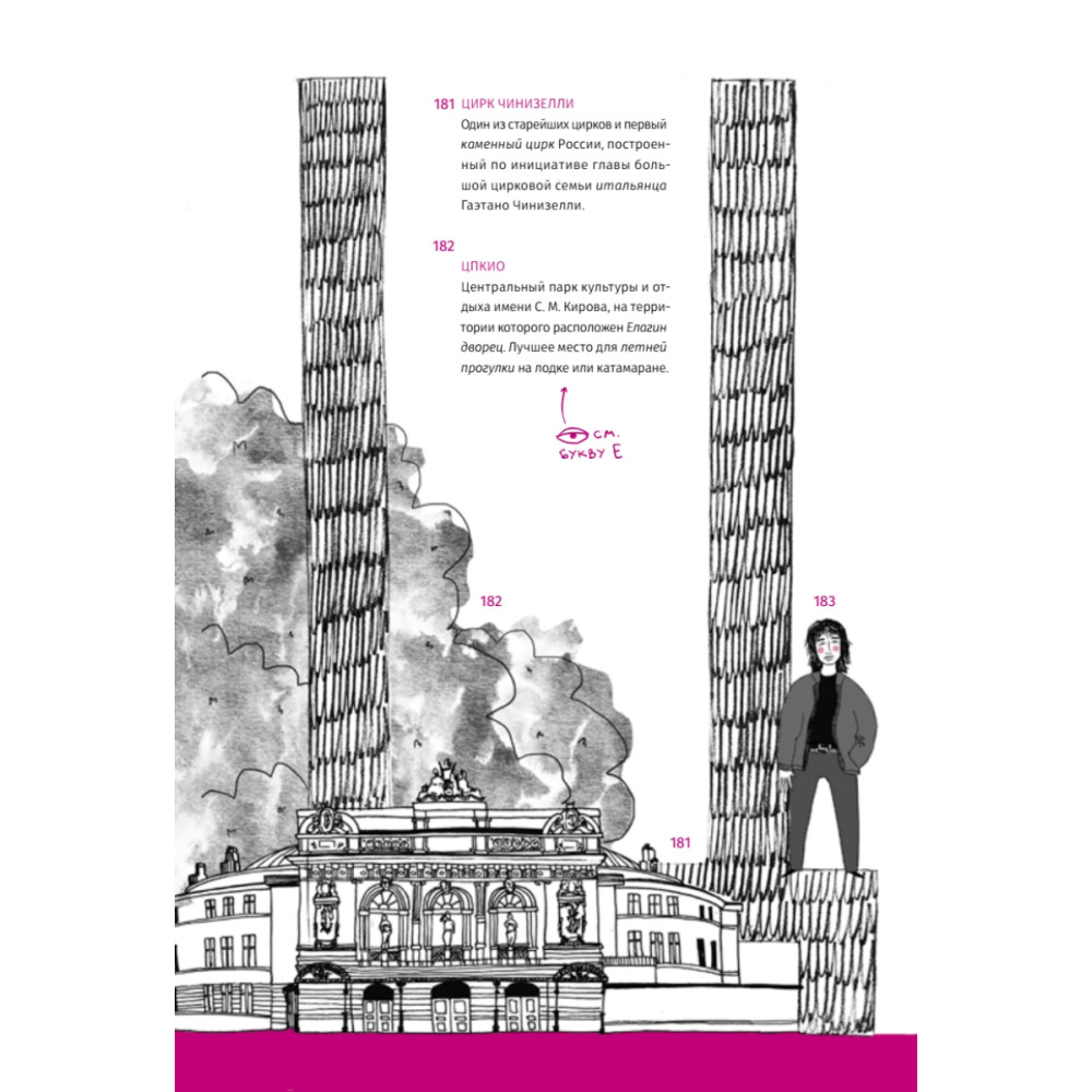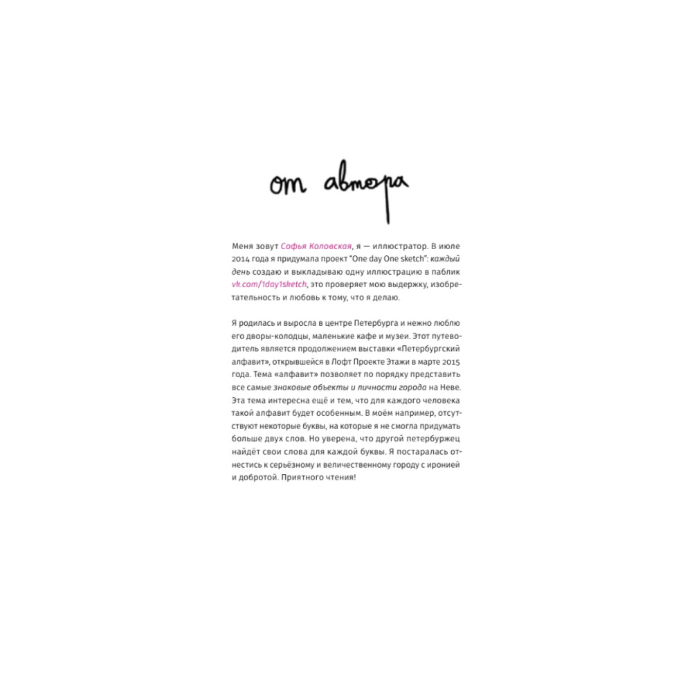 Софья Коловская — автор популярного паблика one day one sketch — видит петербургские достопримечательности по-своему. Ее работы из серии «Петербургский алфавит» с больших успехом выставлялись в Лофт Проекте «Этажи» и были отобраны для параллельной программы фестиваля «Спутник над Польшей». • Где в Петербурге можно увидеть северное сияние? • Куда податься любителю графических романов и комиксов? • Как работает блошиный рынок? • Где наливают культовый коктейль «Грейпфрутовый, как у Ивана»? Неповторимый Петербург от А до Я, отрисованный Софьей Коловской, — душевная прогулка по знакомым и незнакомым местам.