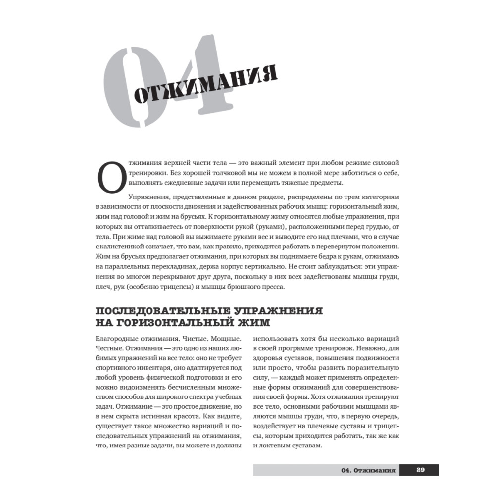 Самое подробное руководство по калистенике охватывает все аспекты уличного воркаута. В первой части вы познакомитесь с основными принципами тренировок. Во второй части вы узнаете все о пяти краеугольных камнях, на которых стоит методика фундаментального развития собственного тела: подтягивания, отжимания, приседания, растяжка и мост. Третья часть знакомит с нюансами выполнения самых сложных и популярных упражнений. В четвертой части речь идет о конкретных программах и методиках. А в пятой части Дэнни и Эл дадут вам множество советов и рекомендаций. "Все серьезные спортсмены и тренеры обязаны купить эту книгу!"— Пол "Тренер" Уэйд