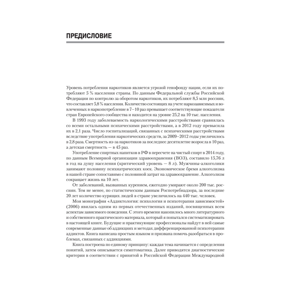 Пособие известного отечественного психотерапевта, доктора медицинских наук, профессора Г. В. Старшенбаума посвящено освещению одного из современных психологических и психотерапевтических направлений - аддиктологии. Многолетний опыт работы с пациентами, страдающими как химическими, так и эмоциональными зависимостями, позволяет автору проанализировать глубинные механизмы различных аддикций. В книге дается детальное описание клинической картины, диагностики и терапии различных форм аддиктивного поведения, приводятся выдержки из историй болезни пациентов, успешно прошедших курс психотерапии по методике, разработанной автором. Пособие предназначено для подготовки психологов, психотерапевтов, психиатров и наркологов.