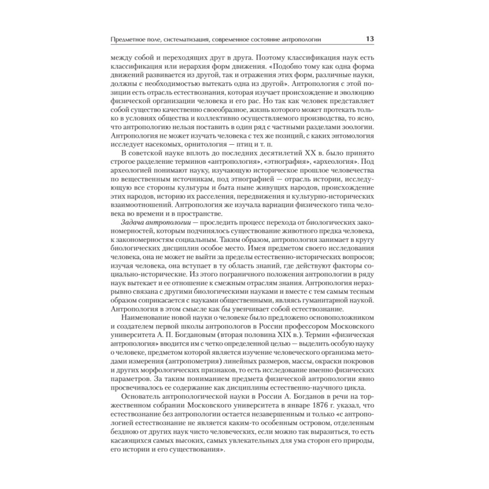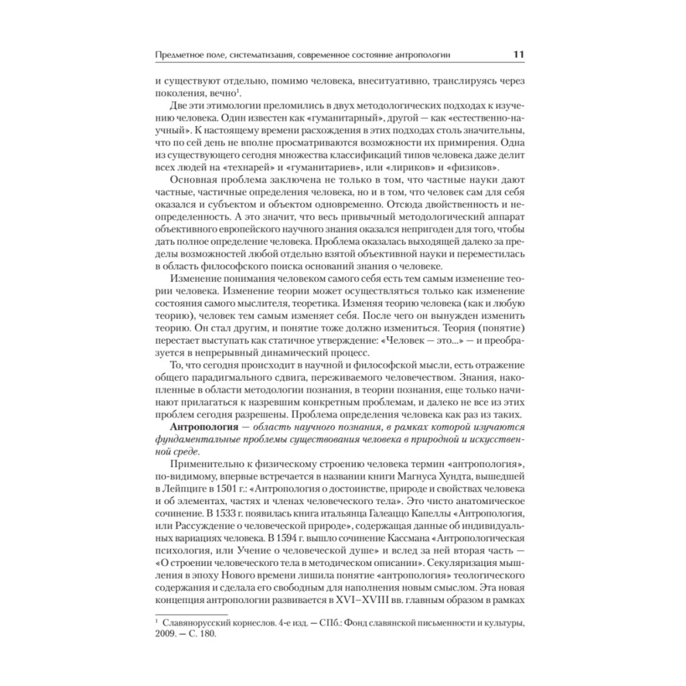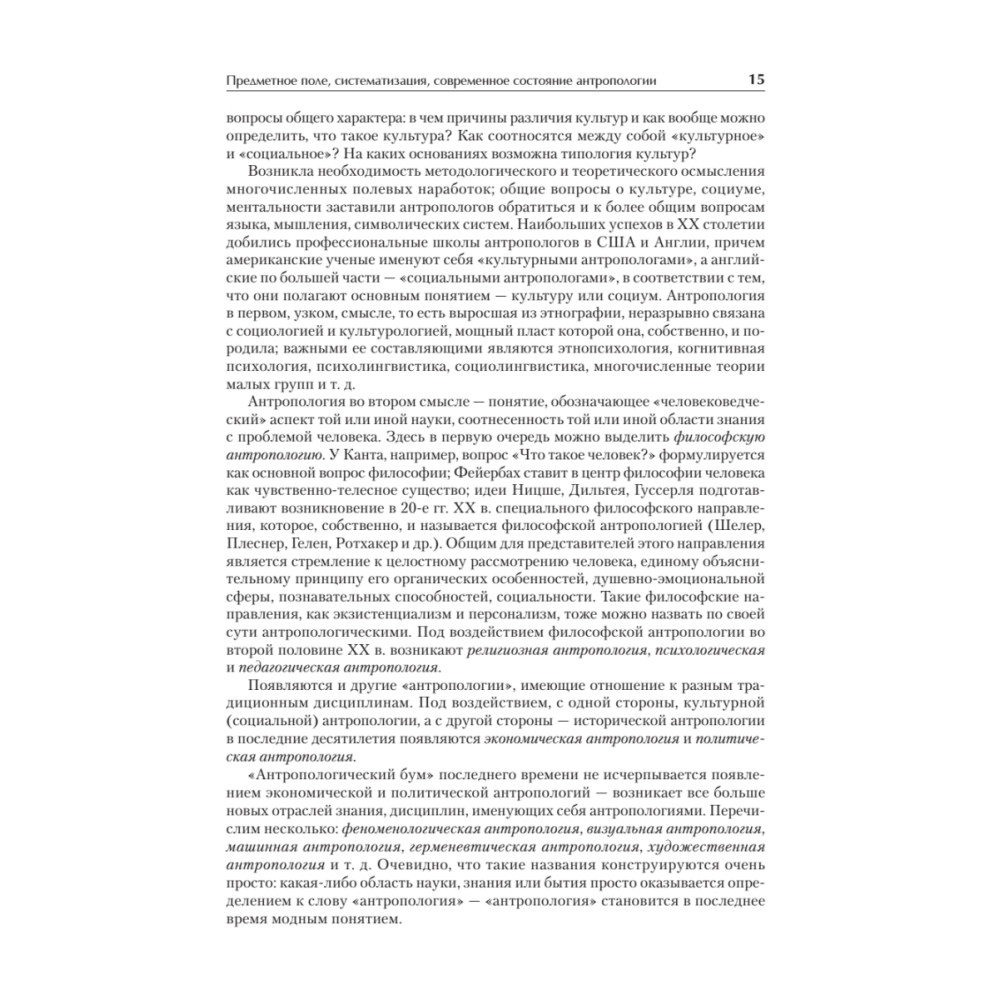 Антропология в настоящее время является одной из наиболее динамично развивающихся областей научного знания, в которой постоянно подвергаются пересмотру сведения и концепции, еще недавно казавшиеся незыблемыми. В настоящее время специальный курс антропологии читается в рамках подготовки специалистов по социальной работе и прикладной этике. Специалисту по социальным и гуманитарным технологиям необходимы сведения о человеке, которые позволили бы ему с максимальной эффективностью осуществлять свою профессиональную деятельность, при этом за анализом конкретных судеб и ситуаций он должен видеть закономерности развития человека и социума, с тем чтобы его действия приносили действительную пользу. Все вводимые понятия по возможности раскрываются автором в тексте учебника, также учебник снабжен «Словарем ­основных понятий по антропологии», в котором раскрываются значения основных категорий курса. Для того чтобы данный учебник мог быть использован для самостоятельной подготовки студентами и преподавателями, в приложение включена примерная программа по курсу «Антропология» для специальностей «Социальная работа», «Прикладная этика», «Работа с молодежью».