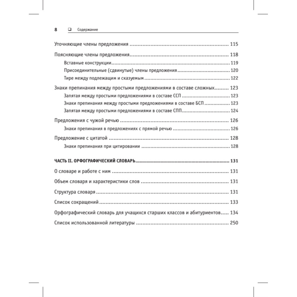 Цель данного справочника — помощь школьнику-старшекласснику в подготовке к ЕГЭ по русскому языку, к контрольным работам, сочинениям, изложениям, диктантам. Справочник включает в себя все основные правила по орфографии и пунктуации, изучаемые в рамках школьной программы. Строгая структурированность материала способствует более легкому пониманию и быстрому запоминанию правил. Наглядные сопоставительные таблицы облегчают процесс заучивания. Орфографический словарь, содержащий наиболее часто употребляемые слова и слова, вызывающие наибольшую трудность в написании, делает справочник незаменимым. Информация, представленная в справочнике, не дублирует учебники, а систематизирует и закрепляет знания. Здесь есть все, что нужно для успешной сдачи экзамена, — и ничего лишнего!