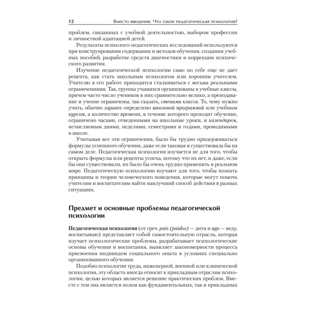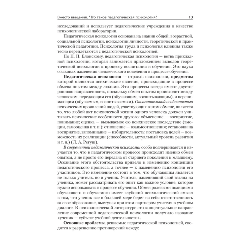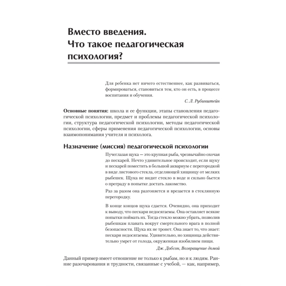 В учебном пособии раскрываются предмет и основное содержание педагогической психологии, рассматриваются важнейшие вопросы психологии обучения и образования. Вы узнаете, с какими психологическими проблемами сталкивается педагог в своей работе, на каких принципах построено развивающее обучение, в чем заключаются психологические детерминанты учебной деятельности. В книге подробно описывается путь становления личности человека под влиянием обучения, воспитания и среды. Теоретический материал в пособии гармонично сочетается с ответами на актуальные практические запросы современной системы образования: авторы уделяют большое внимание технологиям решения профессиональных педагогических задач. Каждая глава пособия включает перечень понятий, которые подлежат усвоению, тексты, в которых они раскрыты, задания для усвоения представленного материала, списки рекомендуемой литературы и вопросы для самопроверки.