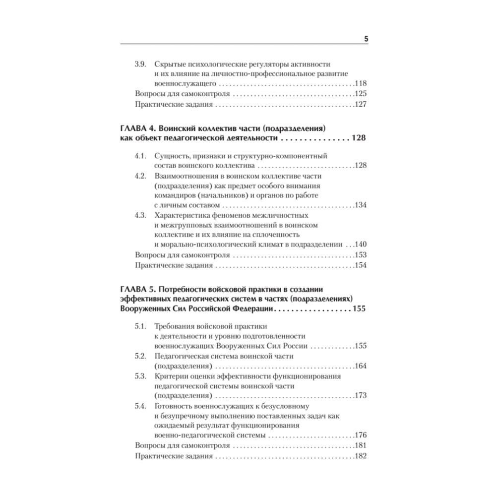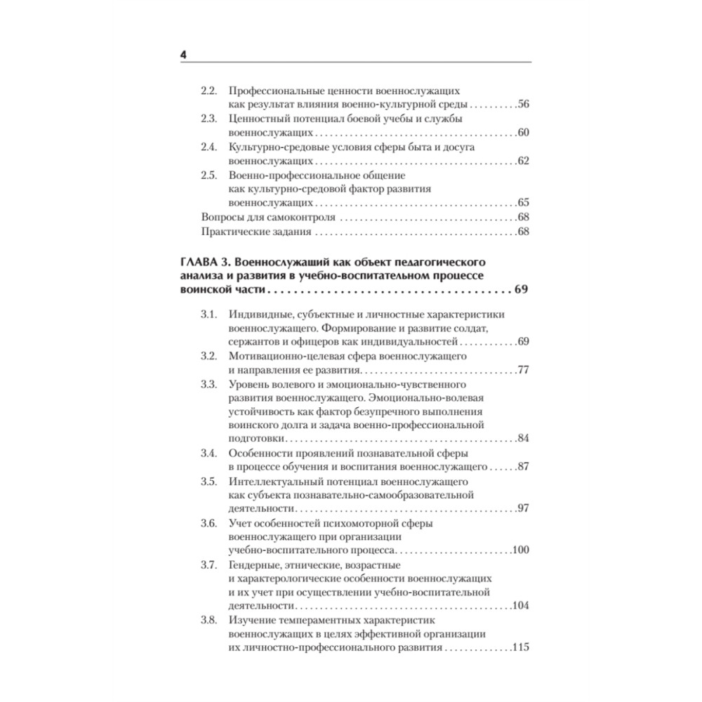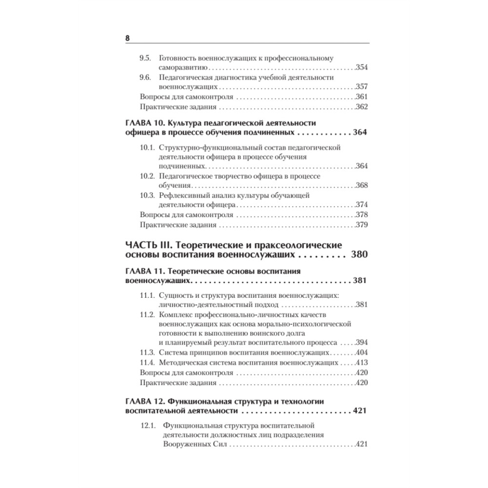 Учебник состоит из трех частей, логически связанных между собой: первая часть позволяет понять сущность и структуру педагогического пространства частей и подразделений Вооруженных сил России; вторая – раскрывает актуальные вопросы обучения военнослужащих; третья – обеспечивает понимание теоретических и методических основ организации воспитательного процесса в частях и подразделениях Вооруженных сил Российской Федерации.