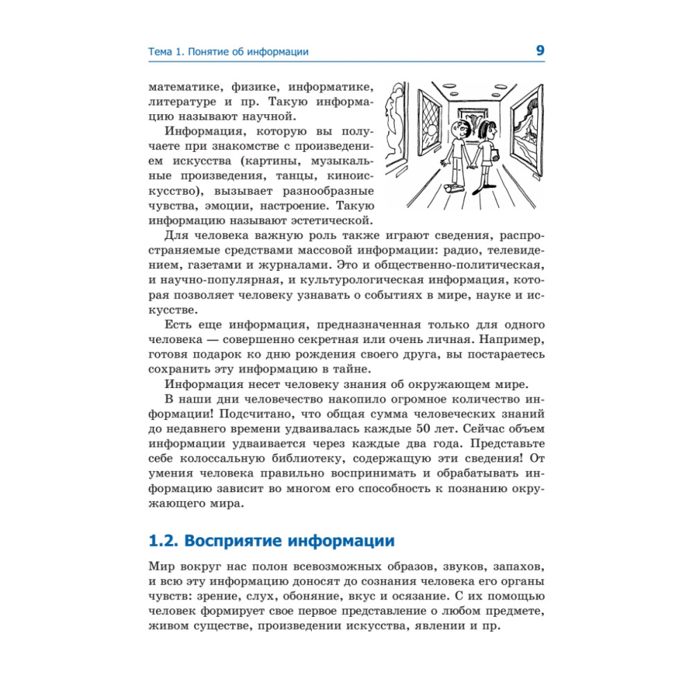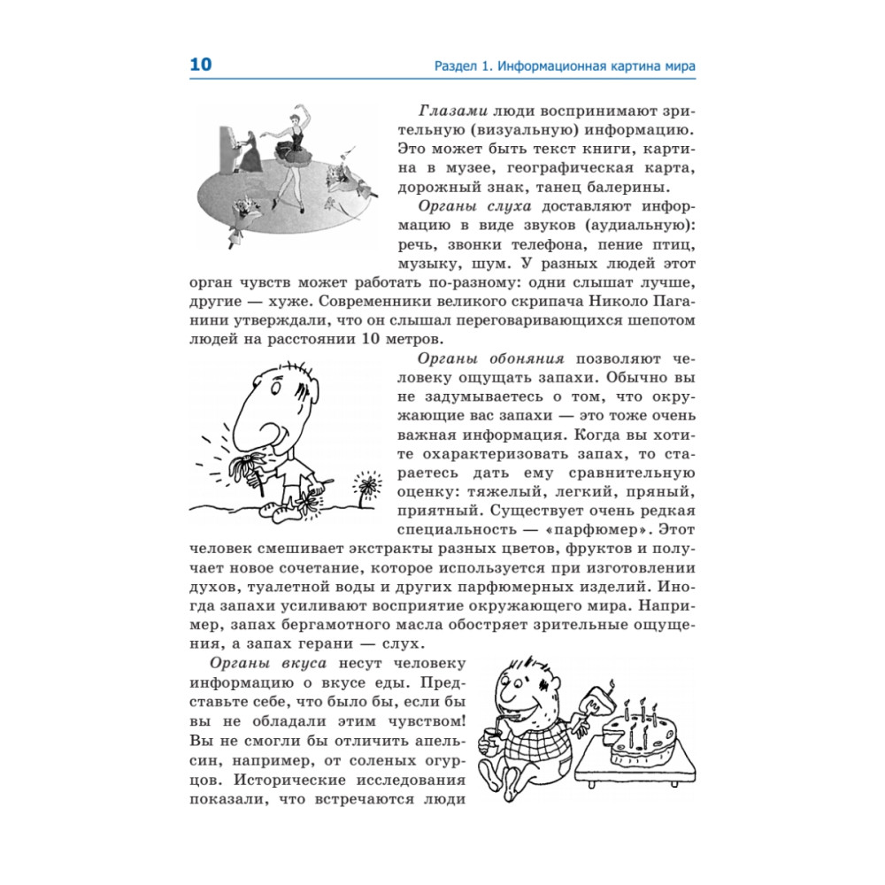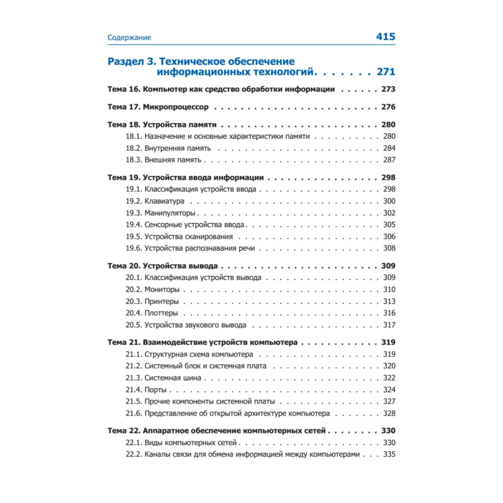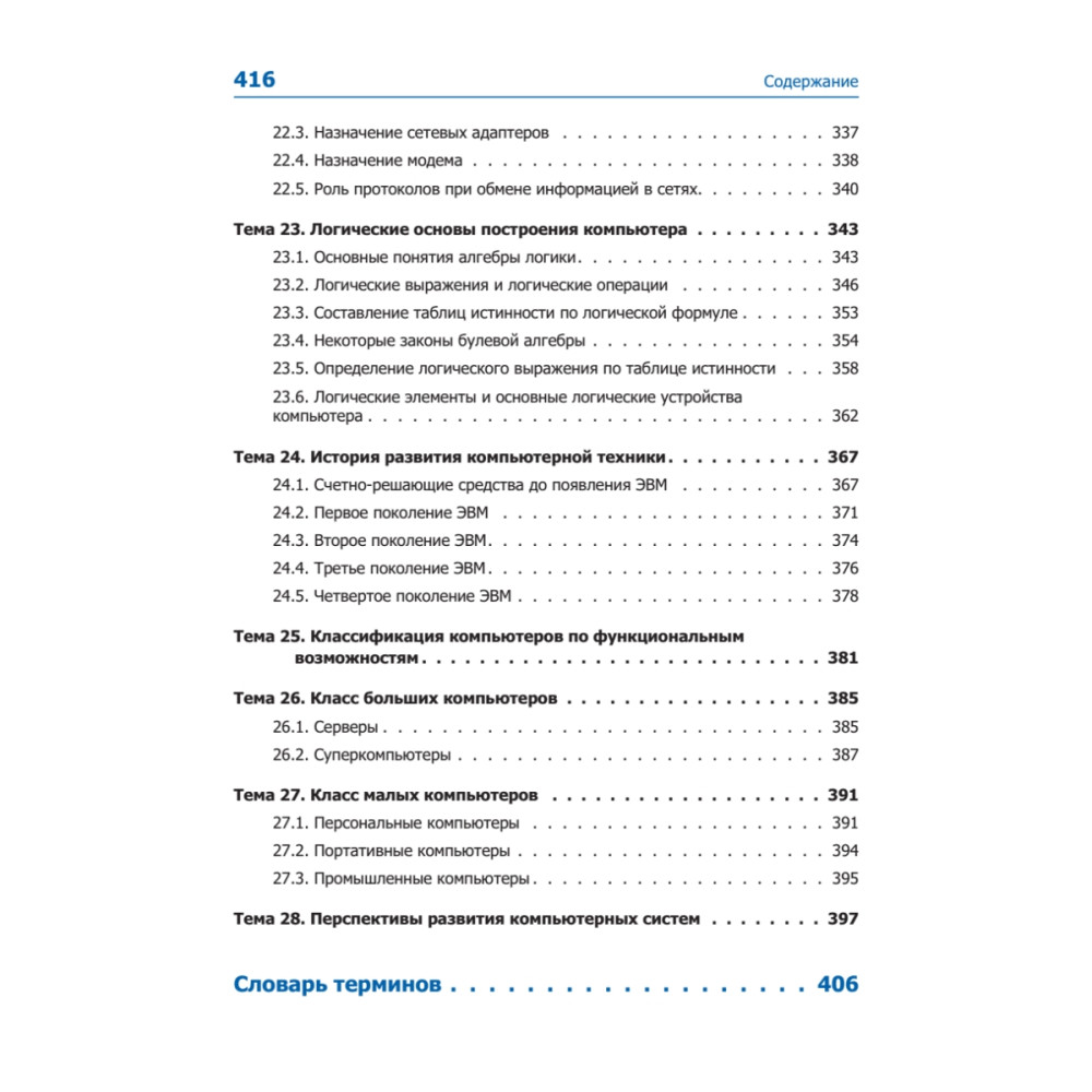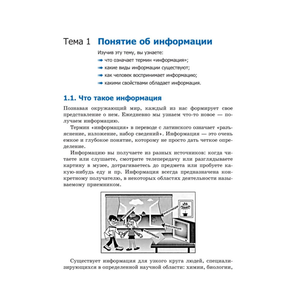 Учебник состоит из трех разделов. В разделе «Информационная картина мира» формируется представление об информации и информационных процессах, об объекте, системе и их моделях, даются основы классификации и приводится классификация моделей, рассматриваются основные этапы моделирования. В разделе «Программное обеспечение информационных технологий» изучаются основы алгоритмизации, формируется представление о программах, системном и прикладном программном обеспечении. В разделе «Техническое обеспечение информационных технологий» учащиеся знакомятся с аппаратной частью компьютеров и сетей, с классификацией, историей и перспективами компьютерной индустрии. Здесь же изучаются логические основы построения компьютера.