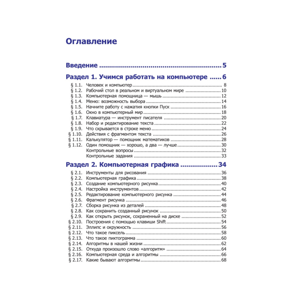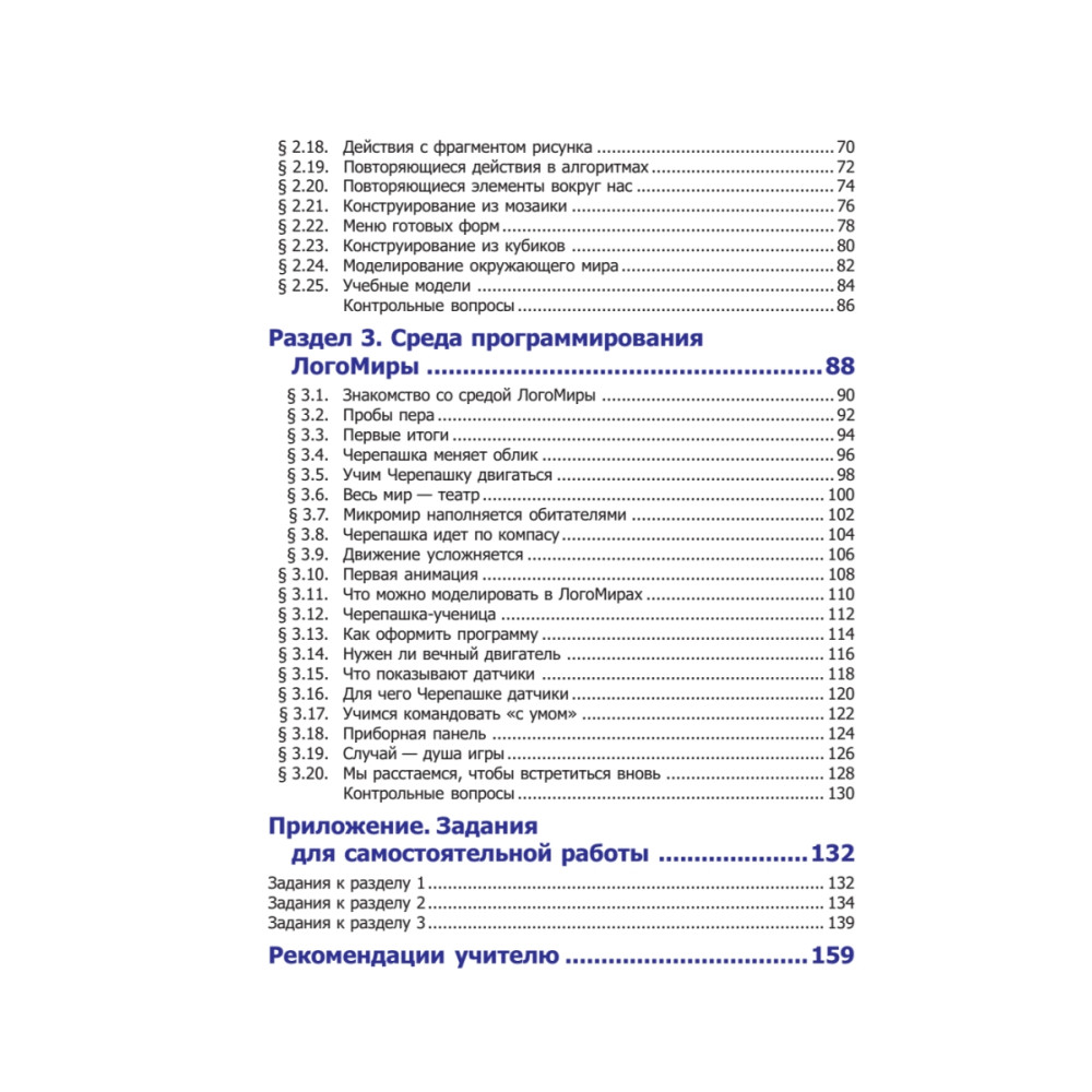 Курс рассчитан на школьников 5–6 классов и ориентирован не только на освоение технологий работы в различных средах, но и на развитие алгоритмического мышления и творческого потенциала. С этой целью в основной части учебника представлено множество практических заданий, а в приложении помещены упражнения для самостоятельной работы.